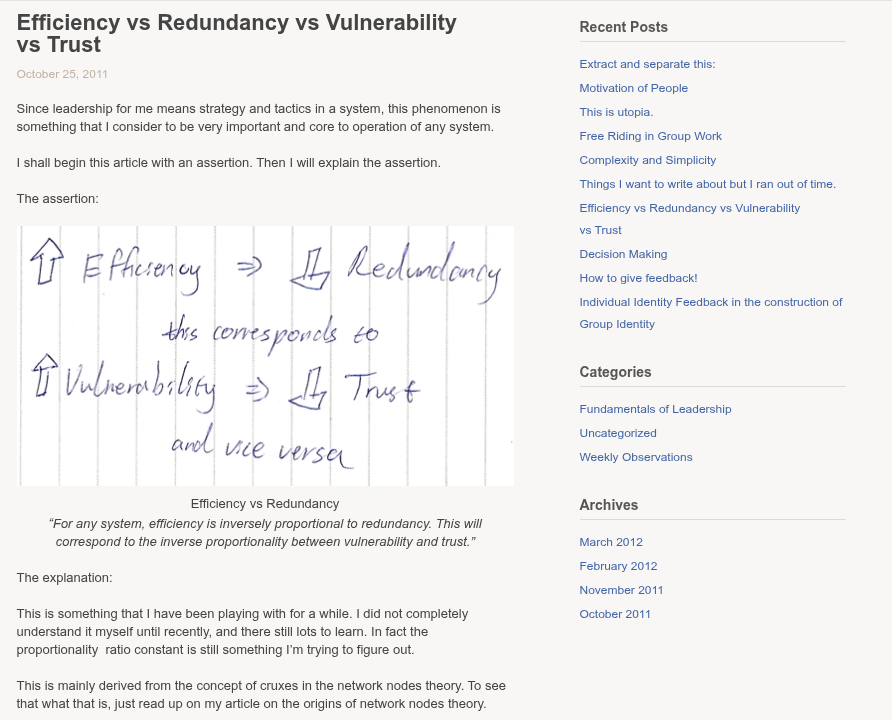 In 2011, as part of an interdisciplinary course at the Australian National University (VCUG20021), I wrote an article about the relationship between efficiency, redundancy, vulnerability, and trust. That post is still online2. The basic principle was focusing on efficiency often meant squeezing out redundancy and buying systemic fragility. Fifteen years later, those notes came back to audit our own systems that we've been building, but the pattern is fractally repeated across our entire technological civilisation.