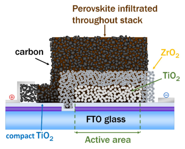 - Carbon Layer (The All-in-One Back Contact): This is a simple, printable "paint" made of carbon (graphite and carbon black). It serves as the top electrode, collecting the "holes" (positive charges) from the perovskite. Crucially, it's also porous, allowing the perovskite solution to be wicked into the stack from behind.